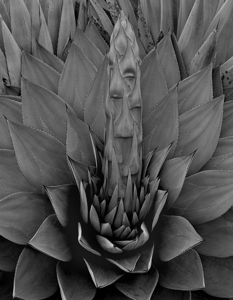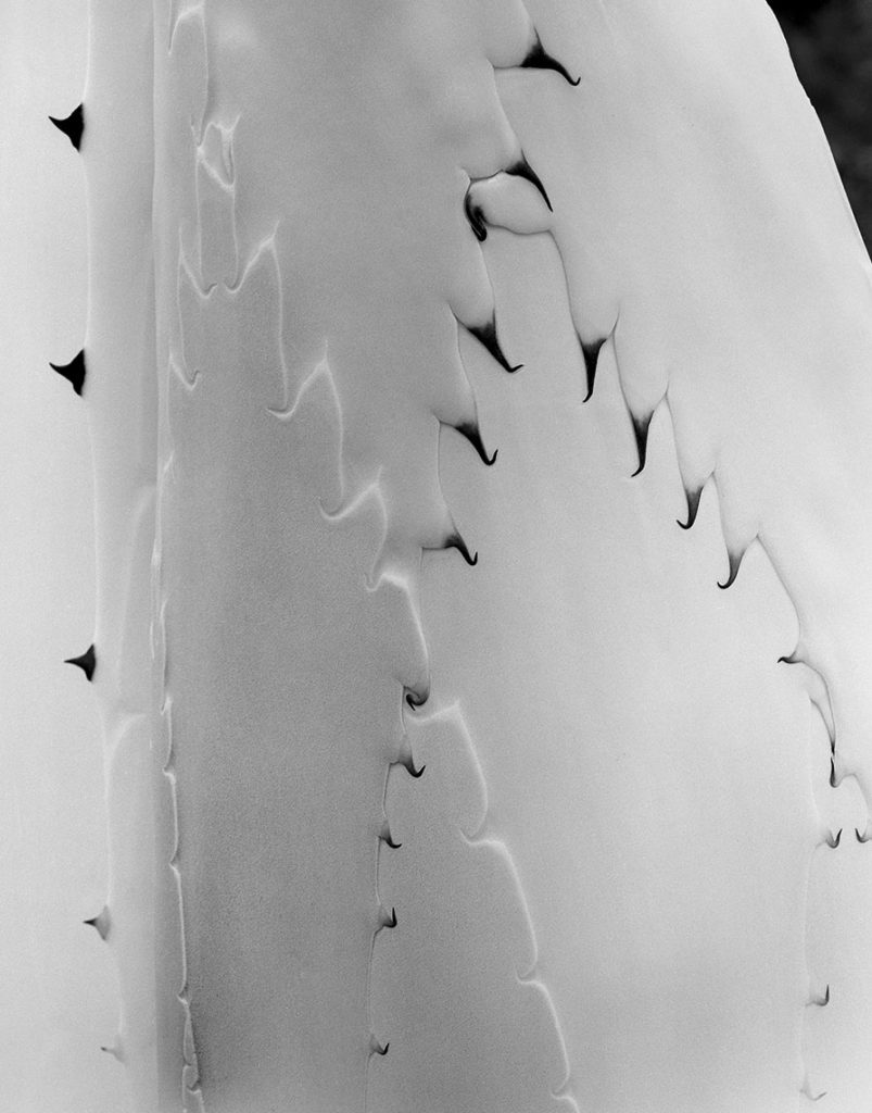 La visión que Chauche nos presenta de los magueyes nos instala en un mundo aparte. Un mundo que viene prestado de la vida y fertilidad vegetal de esta especie y que se desliza hacia un ámbito transfigurado, donde las superficies, las hojas, las afiladas puntas, las espinas se disfrazan de grises, de blancos, de negros y nos aparecen trastocadas.